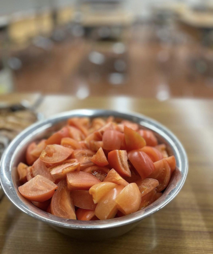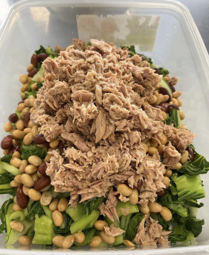 副菜は、団さんの青梗菜と#全国食支援活動協力会 を通じて#ひとり親家庭等の子どもの食事等支援事業 で頂いたシーチキンとドライビーンズの和物、#フードバンク関西 より頂いた#トマト 、