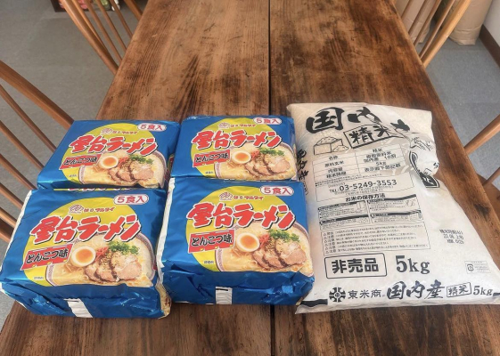 1.2週間分の、すぐに食べれるものとして、お米、ラーメン、調味料、レトルト、麺類、お菓子、パンなど約20キロを支援しました。