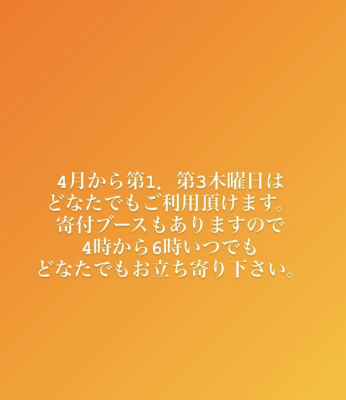 以前から、ひとり親世帯さん以外も利用できないかと考えていて、4月より、第1.3木曜日はひとり親世帯さん以外でもどなたでもご利用頂ける事にしました。