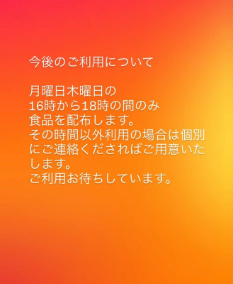 今後の利用について 2025-10-10 17:30:00 月曜日木曜日の16時から18時の間のみ食品を配布します。 その時間以外利用の場合は個別に連絡くださればご用意いたします。 ご利用お待ちお待ちしています。