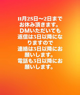 11月25日から12月2日までお休み 2025-11-24 16:00:00 11月25日~12月2日までお休み頂きます。 DMいただいても返信は3日以降になりますので連絡は3日以降でお願いします。 電話も以降にお願いします。