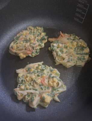 練り物全部切って野菜もなにもかも一緒に冷凍しといて、粉、卵、なんでもいいので、ほんだしとかチューブの素(味の素チャーハンの素使いました)入れて焼いとくと、お弁当や何もない時の一品やアテにいいですよー