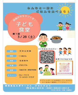 #関西福祉大学 の学生さんのサークル「ひなたびより」が中央公民館(市民会館)にて、初めて子ども食堂を開催します!