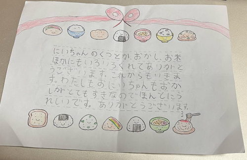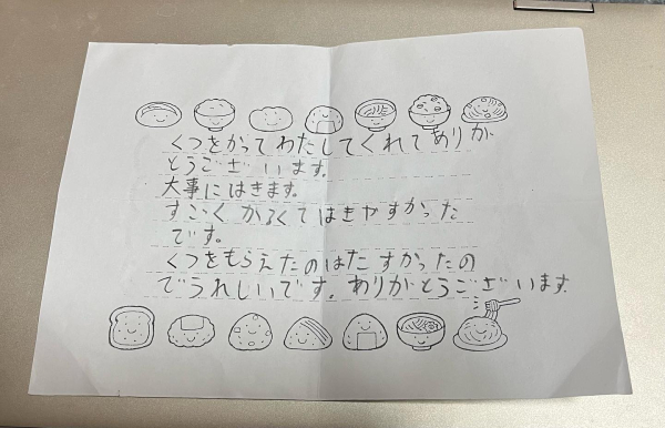靴を寄付された兄妹からお礼の手紙 2022-10-19 00:07:00 S様よりAmazonみんなで応援プログラムを通じて25センチ、24センチの靴をご寄付頂き、差し上げた兄妹からお礼の手紙を頂きました。 ひとり親世帯で、病気で仕事を辞められたので、現在収入がありません。 靴を喜んでくれてよかったです。 S様、いつもご支援を感謝いたします。