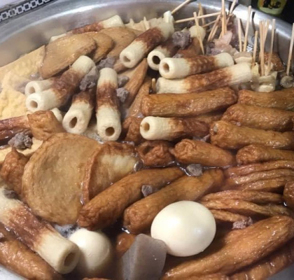 2017年の時のおでんの写真鍋が1人では持てない 笑玉子、ごぼう天、ちくわ、すじ肉、厚揚げ、こんにゃく、ひら天、大根 8種類に決まりました!1個100円持ち帰りOKタッパーご用意してます。お酒ワイン(...