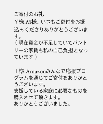 ご報告が遅くなりました。amazonみんなで応援プログラム よりナゲットとウインナーまた、全国こども食堂支援センターむすびえを通じてお米を頂きました。ありがとうございました。...