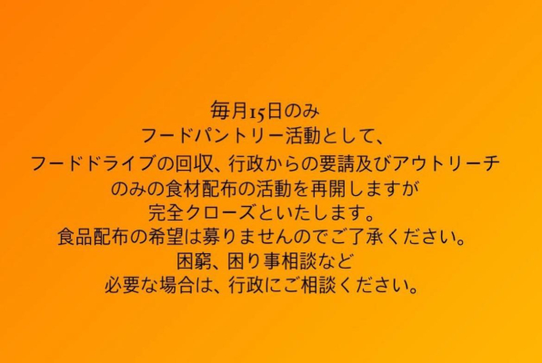 大切なお知らせあけましておめでとうございます。2026年もよろしくお願いいたします。1月8日よりパントリーの利用は365日、無人での運営いた...