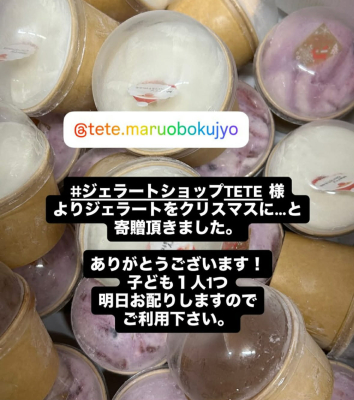 ジェラートショップtete 様よりジェラートを寄贈頂きました!冬休みになるし、子ども達に…とクリスマスプレゼントありがとうございます!明日お配りしますのでご利用下さい。ピザまだの方もdmでご連絡いただ...