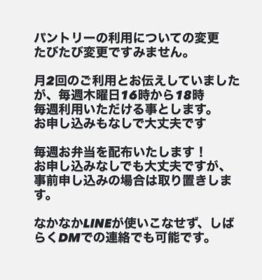 月曜日木曜日の16時から18時の間のみ食品を配布します。その時間以外利用の場合は個別に連絡くださればご用意いたします。ご利用お待ちお待ちして...