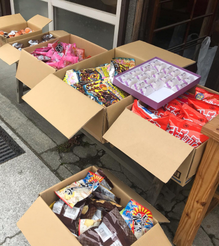 駄菓子屋さんみたい!と、社協のボランティアサークルの皆さんが作ってくれた新聞の袋にお菓子をいっぱい入れて