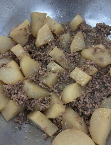 大根はDさんより頂き、万博フードレスキューのひき肉でそぼろ煮に。