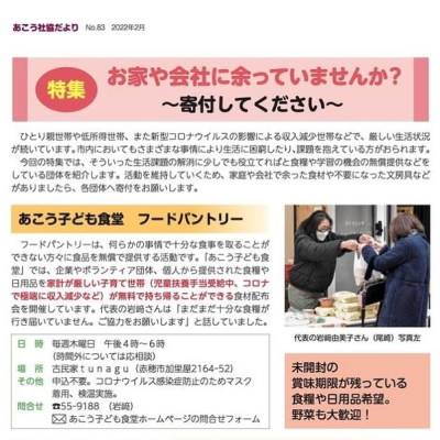 フードパントリーの取り組みをあこう社協便りに掲載いただきました。ありがとうございます。