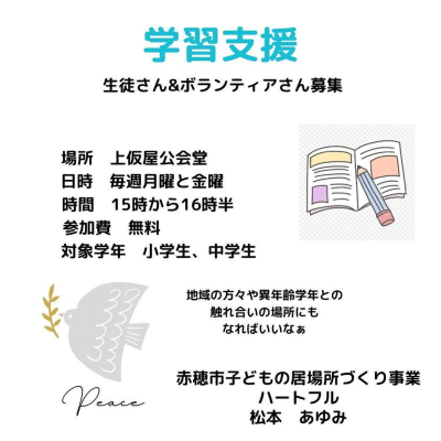城西地区の学習支援 2023-07-31 20:59:00 城西校区で 学習支援が始まります。 8月は 4日、7日、 18日、21日 15時から16時半 だそうです。 #赤穂市居場所づくり助成事業 です。 皆様、ぜひご利用ください。