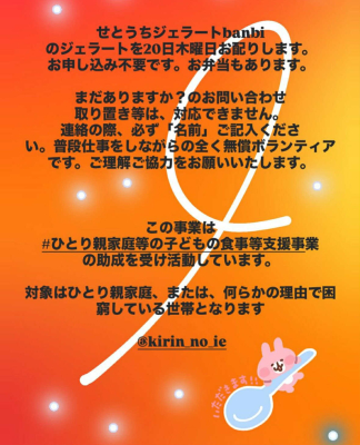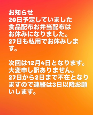 20日木曜日16時から18時の間、食品をお配りします。お弁当もありますのでご利用下さい。時間内に来れないと言う方は①お名前 ②何時に来ますを...